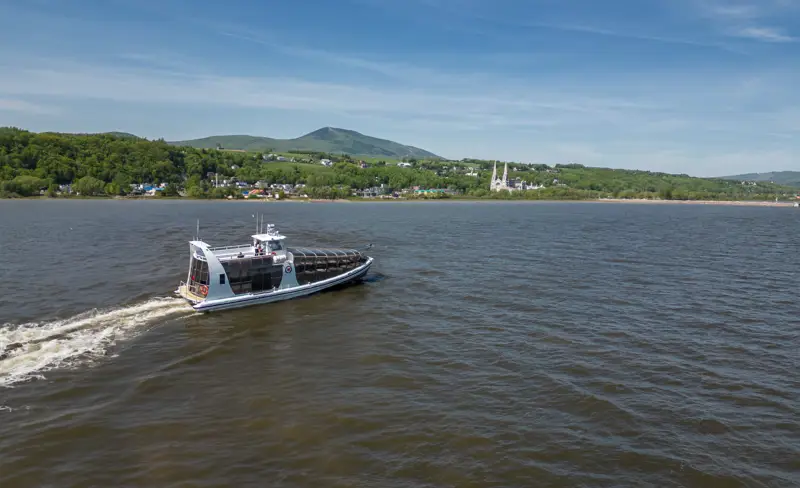 The AML Suroît is a ship that will impress you with its beautiful tapered lines and glassed-in spaces. With a capacity of up to 121 passengers, the Suroît stands out thanks to its panoramic room entirely made of glass and its outdoor terrace.