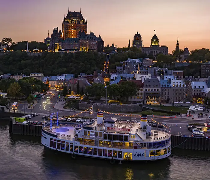Indulge in an unforgettable evening experience aboard the DJ and Cocktail Cruise. Immerse yourself in the atmosphere: enjoy a delicious cocktail on one of the boat’s terraces, with music provided by a DJ, and take in the breathtaking view of the beautiful city of Quebec. It is the perfect recipe for a successful summer night. Hungry? Take advantage of our onboard bistro to satisfy your cravings.
