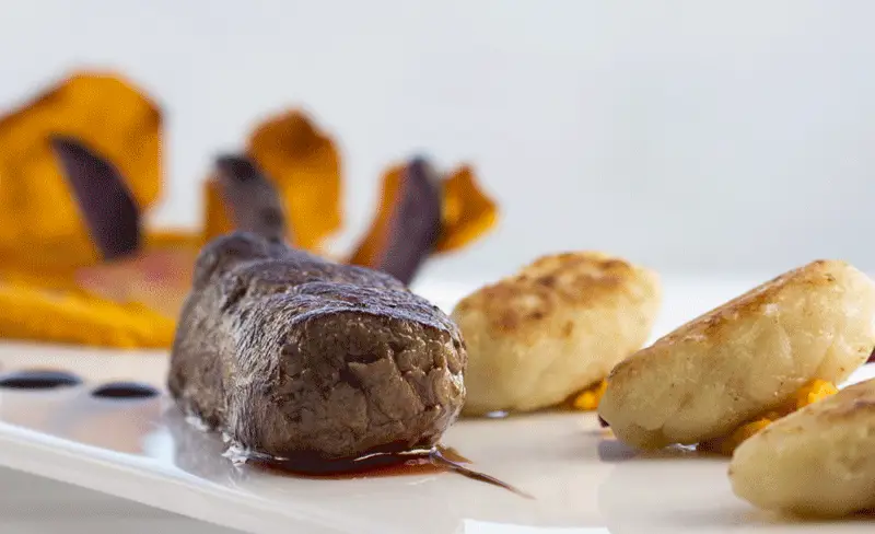 Volaille végétalienne et épinards gratinés, accompagné d’un ragoût de champignons rôtis et de légumes du maraîcher