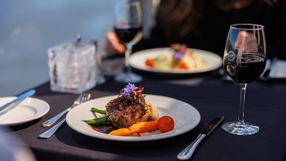 Dégustez votre savoureuse table d'hôte 3 services tout en profitant du magnifique panorama de Québec et de Lévis. Découvrez la cuisine bistronomique locale de notre chef exécutif et vivez une expérience unique alors que la vieille capitale s'illuminera sous vos yeux. Table d’hôte 3 services préparée par notre chef et sa brigade Vue imprenable sur la chute Montmorency et passage sous les ponts DJ et piste de danse en soirée -